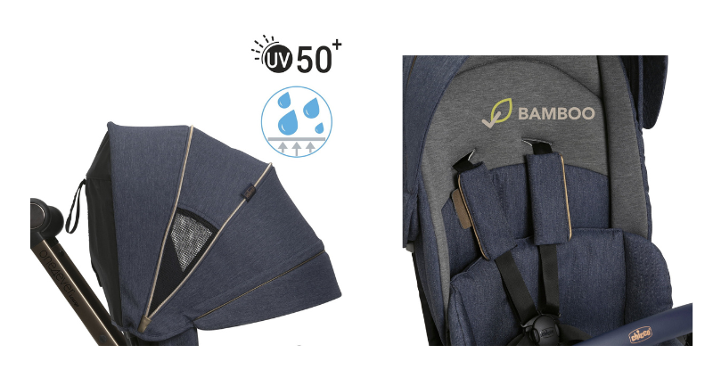 - Rozszerzana budka z filtrem UV 50+ i powłoką wodoodporną – pełna ochrona przed słońcem i deszczem.