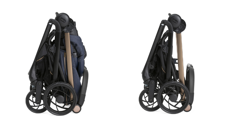 - System automatycznego składania – wózek składa się sam jednym ruchem i stoi samodzielnie.