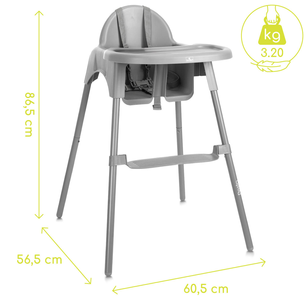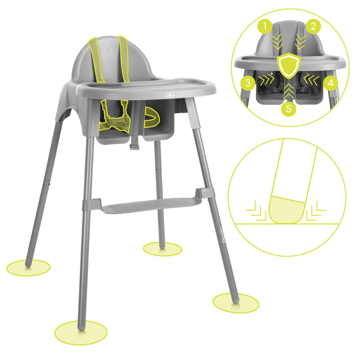 Pesto wykonano z wytrzymałych materiałów – stalowa rama oraz tworzywo PP gwarantują stabilność i trwałość. Stabilna podstawa zapewnia bezpieczeństwo, nawet gdy dziecko jest bardzo ruchliwe. Krzesełko służy przez długi czas i świetnie sprawdza się w codziennym użytkowaniu.
