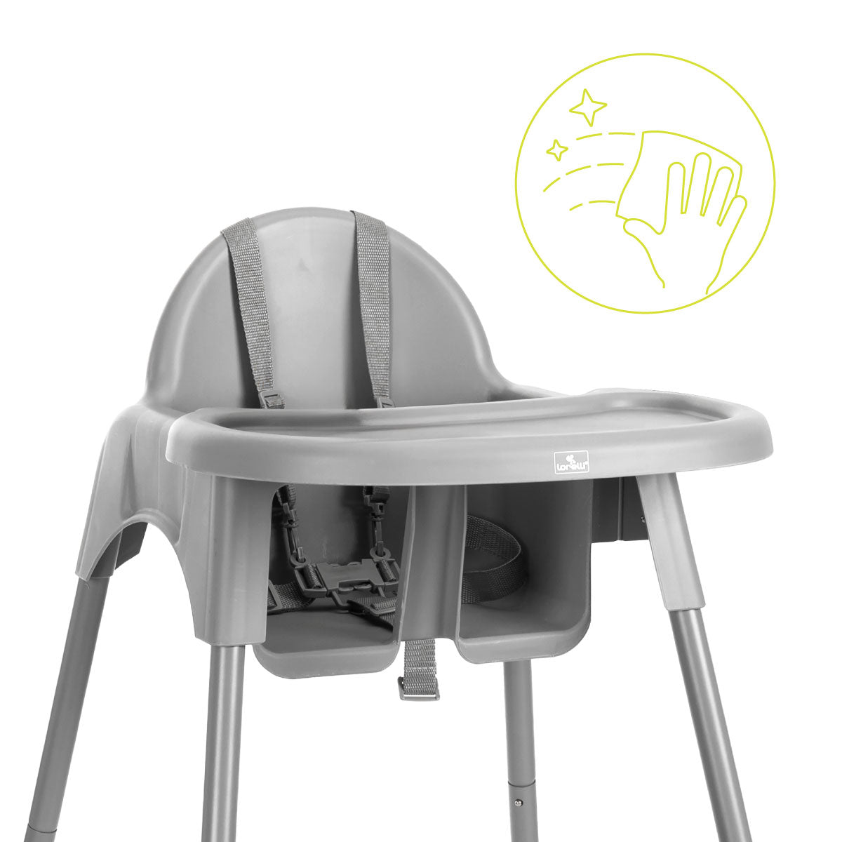 Krzesełko zostało zaprojektowane z myślą o prostym utrzymaniu w czystości. Gładkie powierzchnie i możliwość demontażu tacki sprawiają, że wystarczy chwila, by przywrócić mu świeżość. To ogromna zaleta dla rodziców ceniących sobie wygodę i oszczędność czasu.